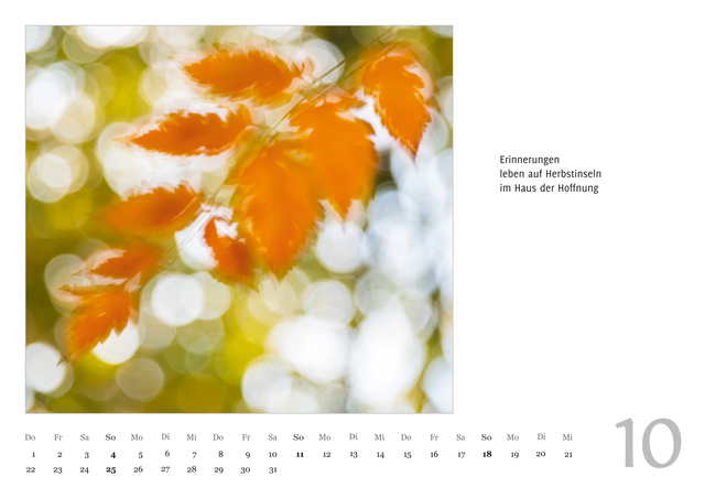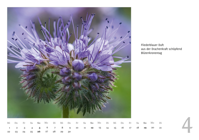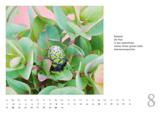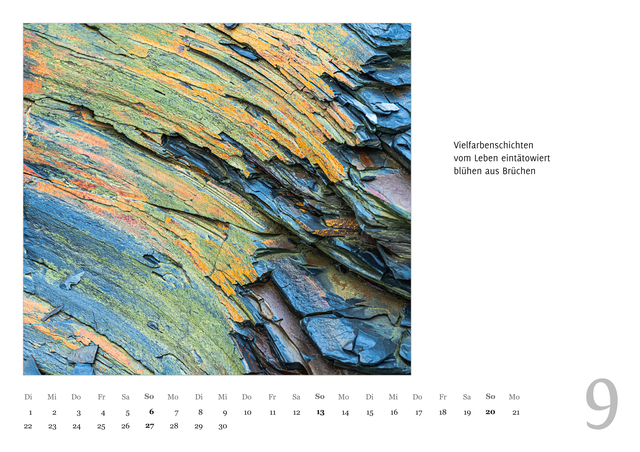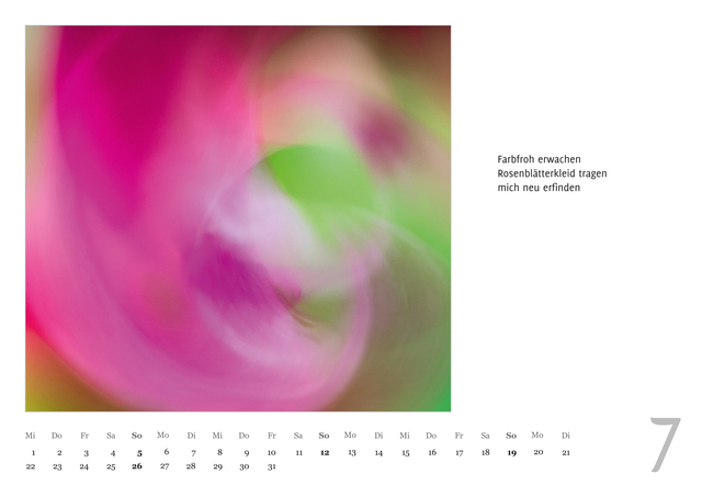 Ausdrucksstarke farbenfrohe Nahaufnahmen begleiten Sie auf ganz besondere Weise durchs Jahr. Den großformatigen Wandkalender farbe:form:natur gibt es sowohl in DIN A2 als auch in DIN A3, die sich als Wandschmuck eignet, wenn man nicht so viel Platz zur Verfügung hat. Neben diesem Kalender gibt es wie jedes Jahr den Kalender mit ausdrucksstarken kurzen Texten der Kölner Lyrikerin Cornelia Ehses in DIN A3 und einige Themenkalender mit ewigem Kalendarium.