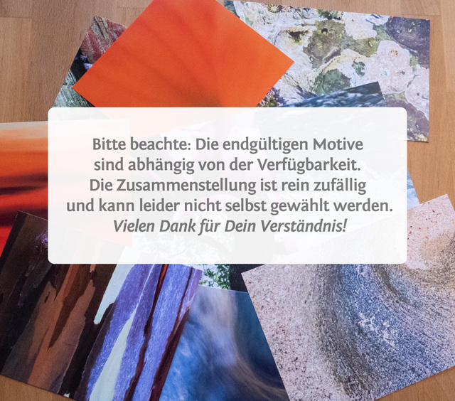 Diese einzigartigen nachhaltigen Fotopostkarten entstehen als Upcycling aus Seiten meiner Fotokalender der vergangenen Jahre, die ich mit einer Schneidemaschine in unterschiedliche Größen zerschneide. Durch die Ausschnitte aus den Makroaufnahmen ergibt sich eine abstrakte Bildwirkung, bei der Farben und Formen im Vordergrund stehen. Manchmal muss man rätseln, was das ursprüngliche Bild dargestellt hat :-). Das Set enthält jeweils 10 Postkarten in verschiedenen freien Formaten von quadratisch bis rechteckig mit unterschiedlichen Motiven. Dabei sind Stein- und Sandstrukturen und Wassermuster sowie Details von Blättern Blüten und Bäumen.