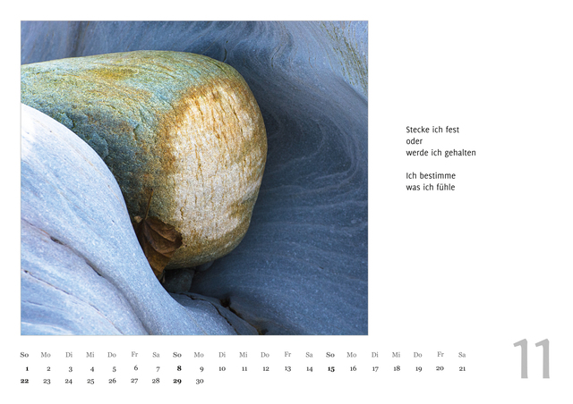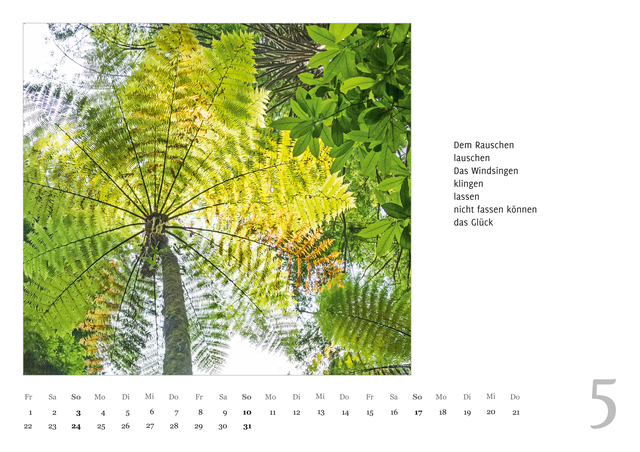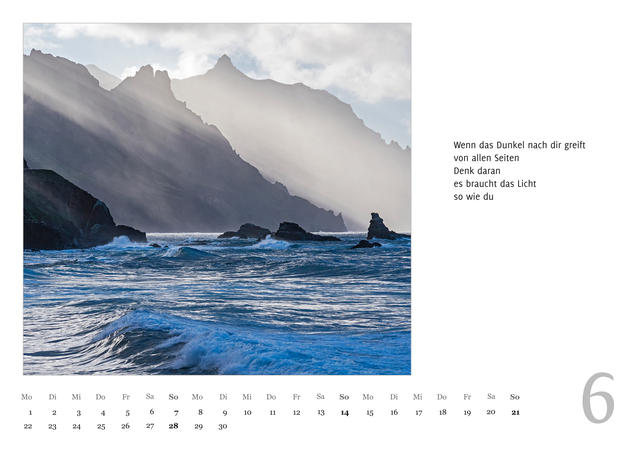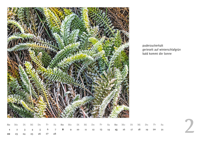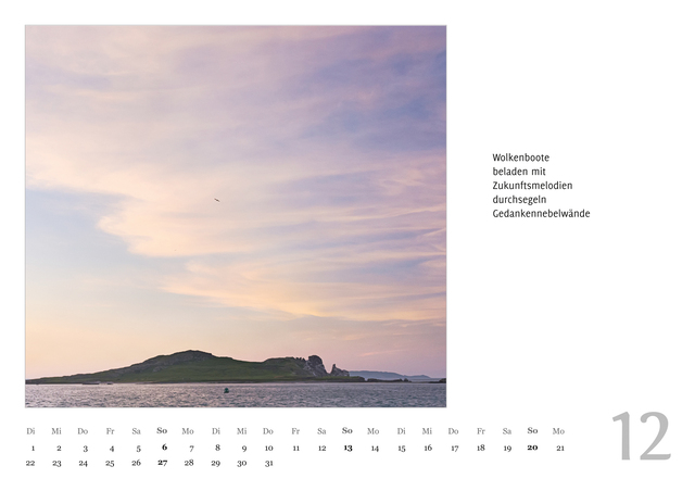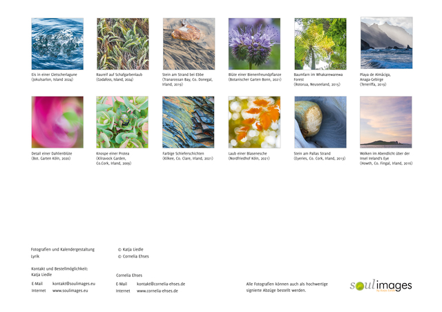 Unter dem Motto "Der Windspur folgen" sind im diesjährigen Kalender Motive versammelt, die u.a. auf Reisen nach Island, Neuseeland und Irland entstanden sind. Neben Landschaften finden sich wie immer ungewöhnliche Nahansichten der Natur, die einladen, eine kurze Auszeit vom Alltag zu nehmen. Dieses besondere Projekt entsteht jedes Jahr (seit über 20 Jahren!) in engem Austausch mit der Kölner Autorin Cornelia Ehses, ihre ausdrucksstarken kurzen lyrischen Texten begleiten die Fotografien und geben ihnen eine weitere Dimension. Der Kalender eignet sich z.B. als ungewöhnliches Geburtstagsgeschenk für Lyrikfreunde mit einem Faible für besondere Naturfotografien.