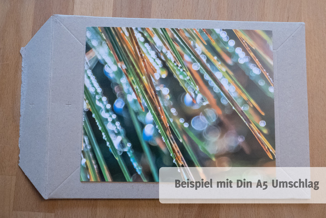 Die Größe ist individuell sehr unterschiedlich, der Versand als Postkarte ohne Umschlag empfiehlt sich eher nicht, da sie nicht den Standardgrößen entspricht. Man kann sie entweder als Grußkarte zu einem Geburtstagsgeschenk o.ä. nutzen oder in einem C5 Umschlag verschicken (162 x 229mm, etwas größer als DIN A5, s. Abbildung, wird nicht mitgeliefert).